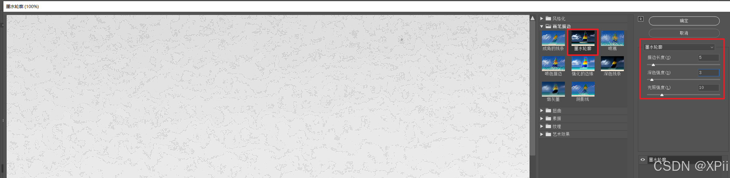 模糊图层执行滤镜->滤镜库->画笔描边->墨水轮廓命令,将描边长度设置为15,深色强度设置为3,光照强度设置为10;