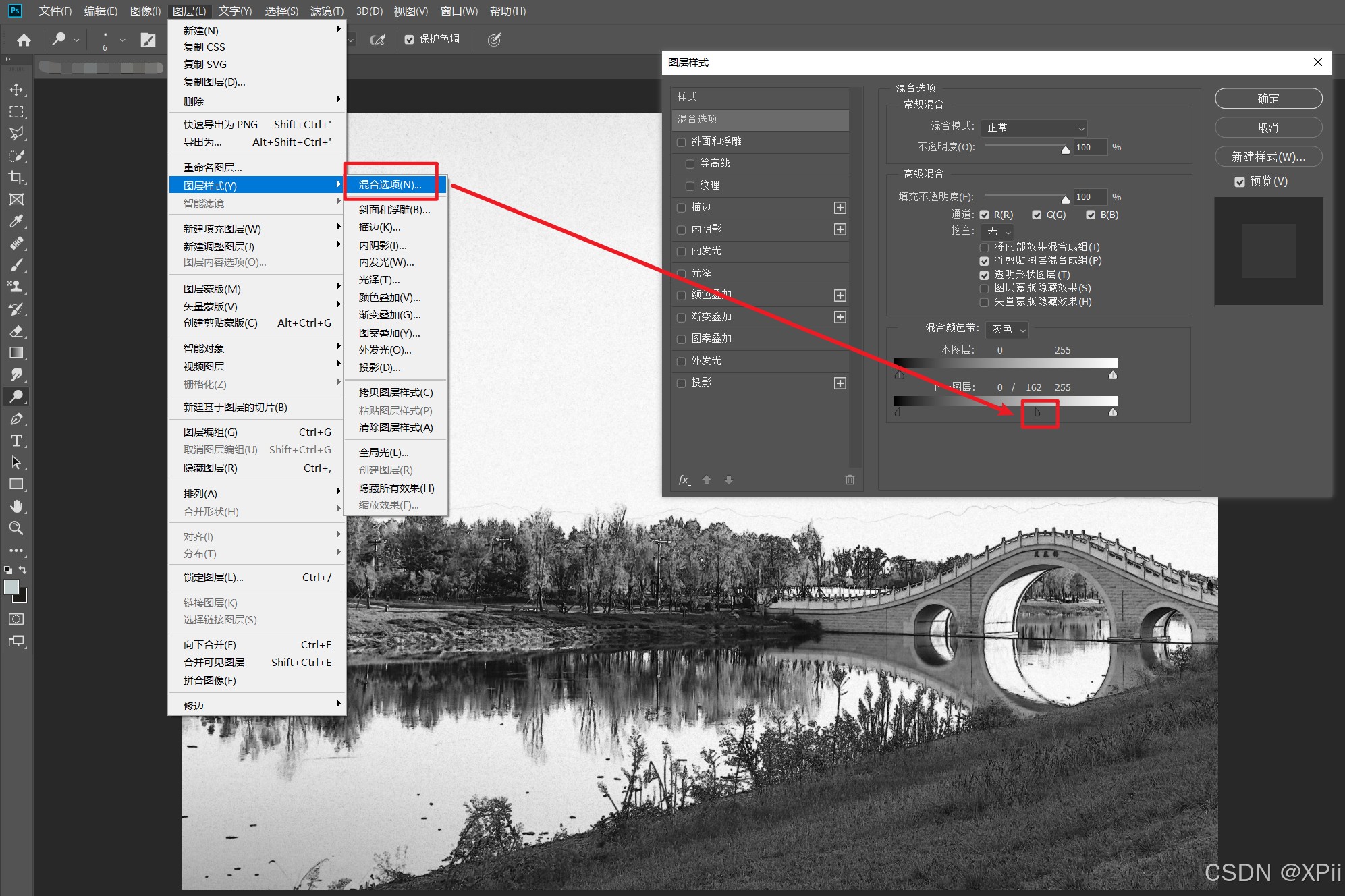 边缘图层执行图层->图层样式->混合选项命令,对混合颜色带进行设置,按住Alt键,单击黑色滑块,将滑块分开并拖动至适当位置;