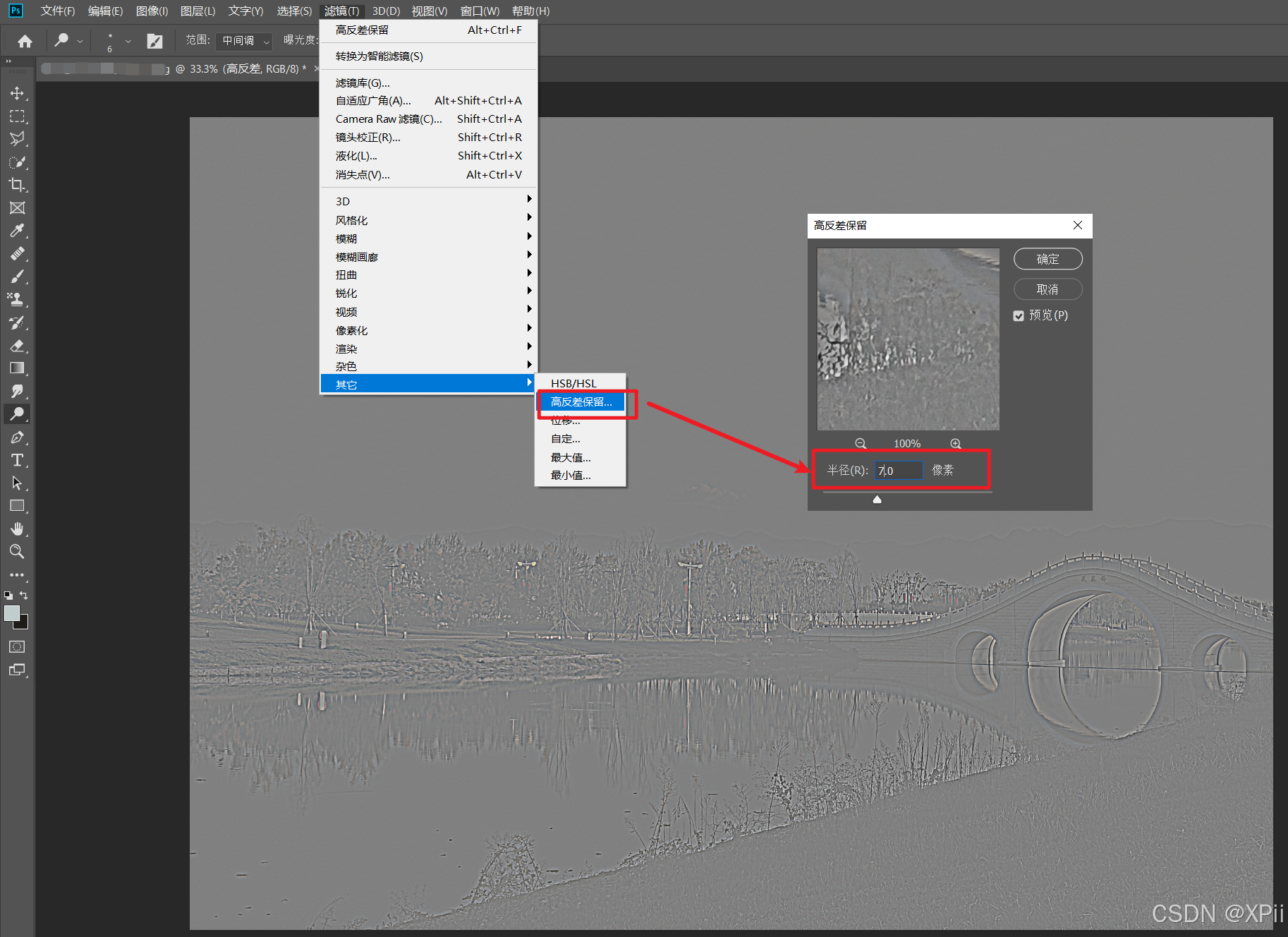 高反差图层执行滤镜->其他->高反差保留命令,在弹出的对话框中将半径设为7像素;