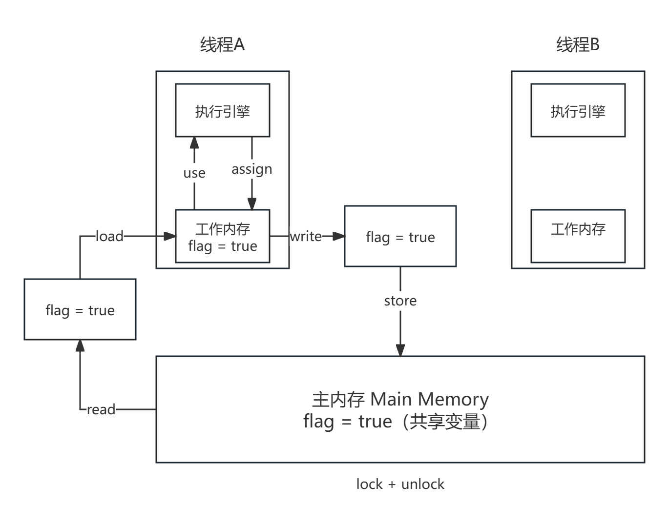 | use | 工作内存→CPU | 线程真正使用变量(参与计算) |