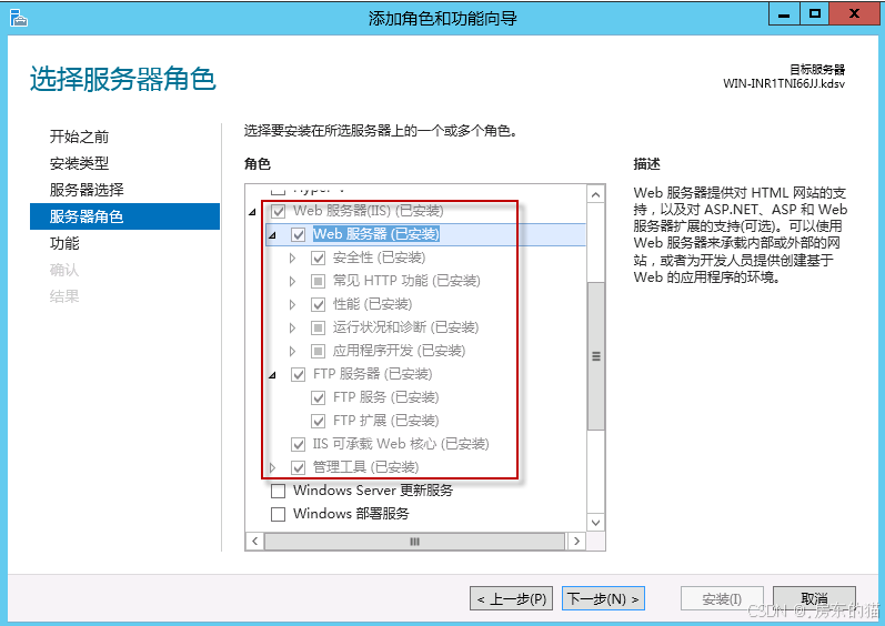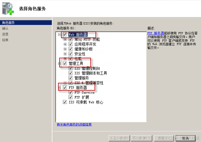 服务器管理器------角色------添加角色中,选中WEB服务器(IIS),管理工具,FTP服务器。如下图: