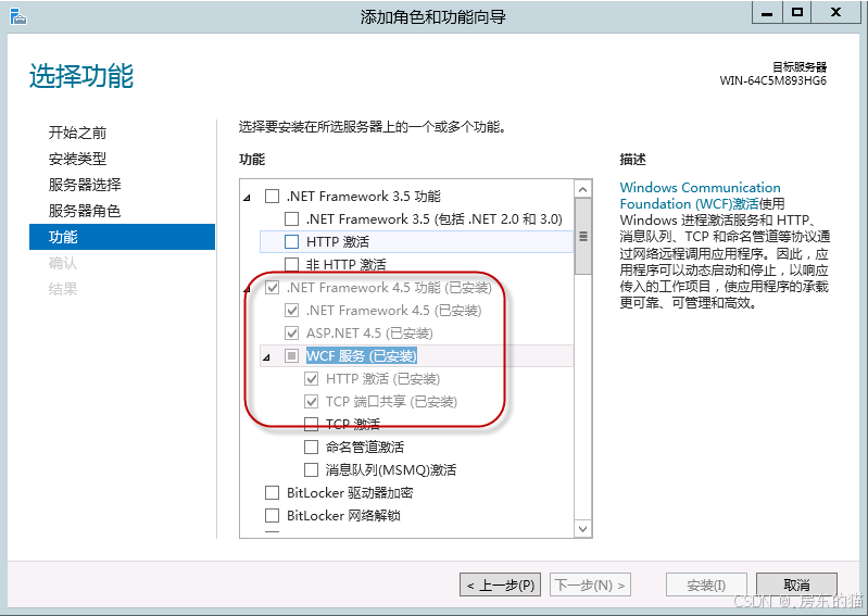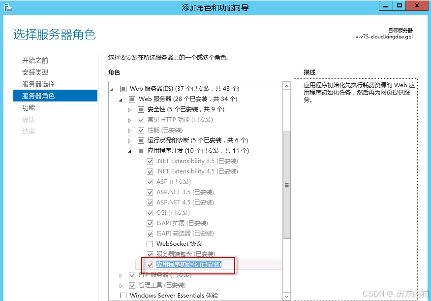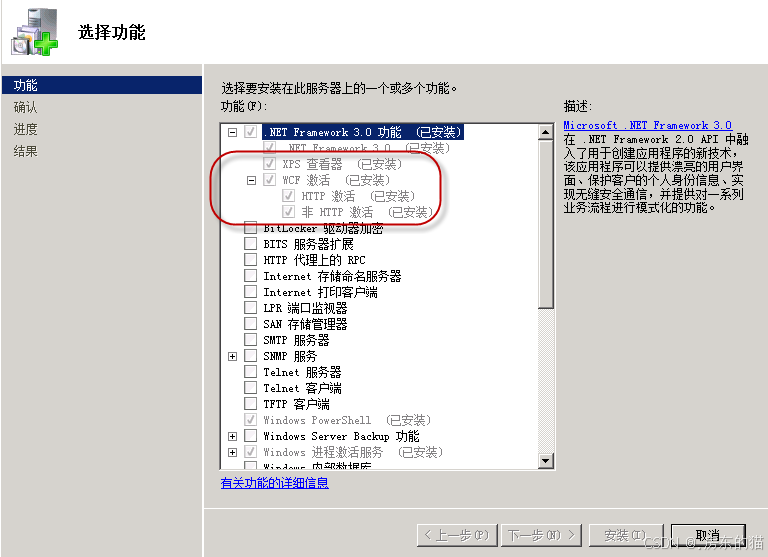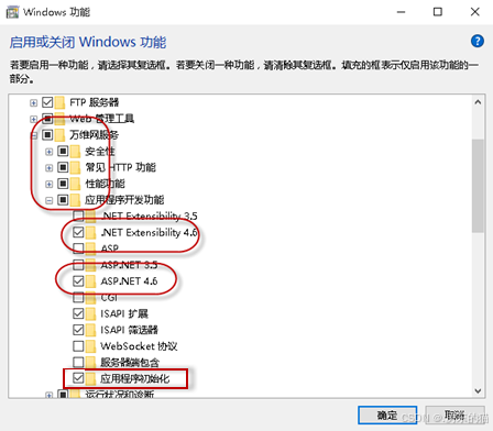 安装IIS(Internet信息服务管理器、万维网服务、公用文件、文件传输协议(FTP),WCF,应用程序初始化等服务组件)。