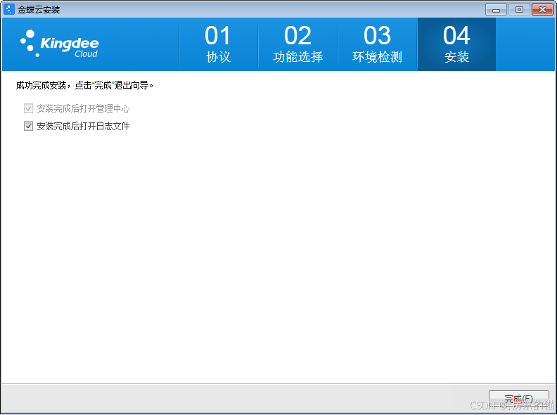 安装完成后,点击完成,系统默认打开管理站点,可进行管理数据中心的创建。打开安装日志,可查看安装过程的日志信息,便于出现问题的时候定位问题。安装日志可在开始------运行中输入%temp%,在临时目录中打开K3Setup.log。