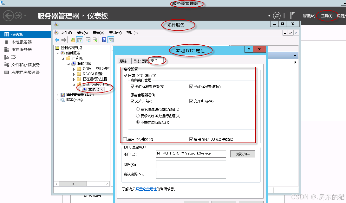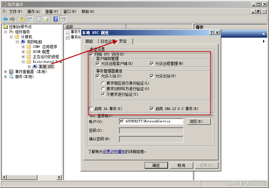 Windows Server 2008R2打开控制面板的管理工具------组件服务------我的电脑------本地DTC右键属性------安全中,如下图所示进行安全设置。