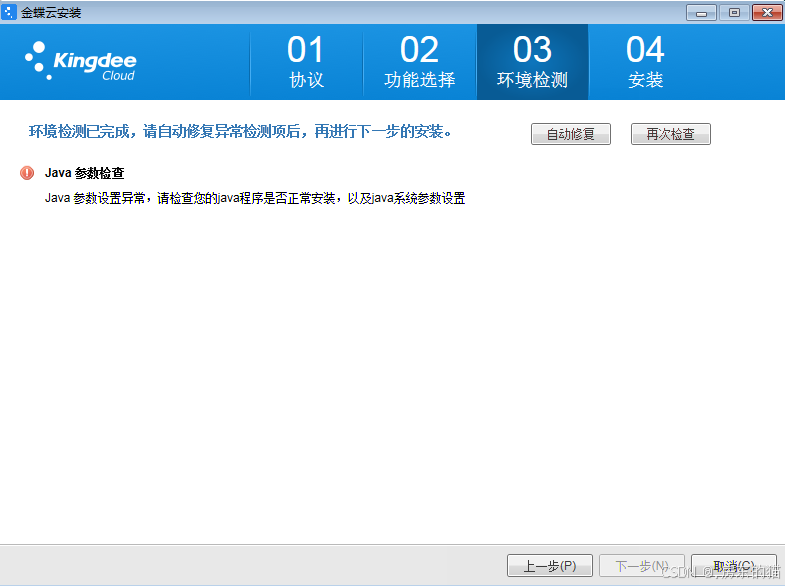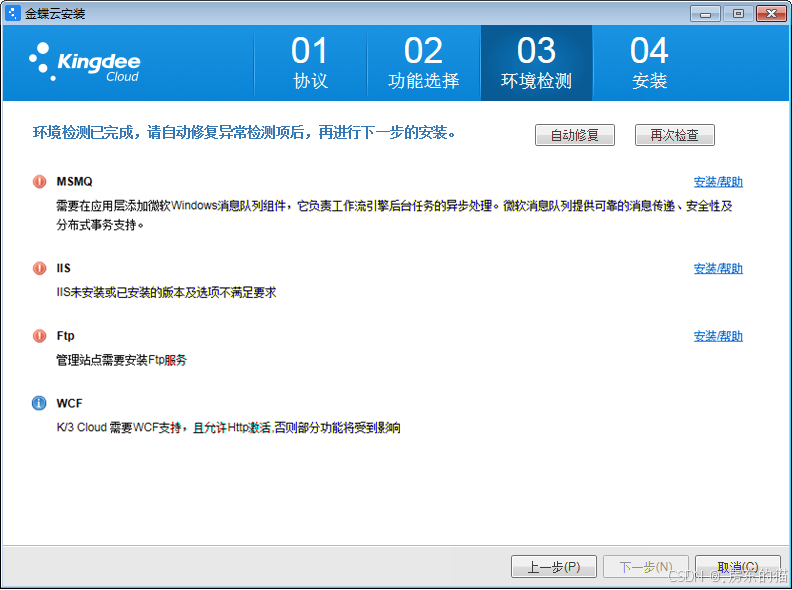 运行安装包,在环境检测后,对产品依赖的Windows组件服务的安装如果未安装,界面上会提供自动修复功能,请使用自动修复工具进行修复和安装。
