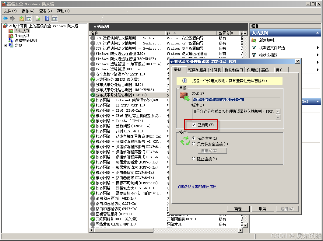 如果启用了防火墙,需要在windows防火墙->高级设置->入站规则中设置(分布式事务处理协调器(TCP-In))启用;