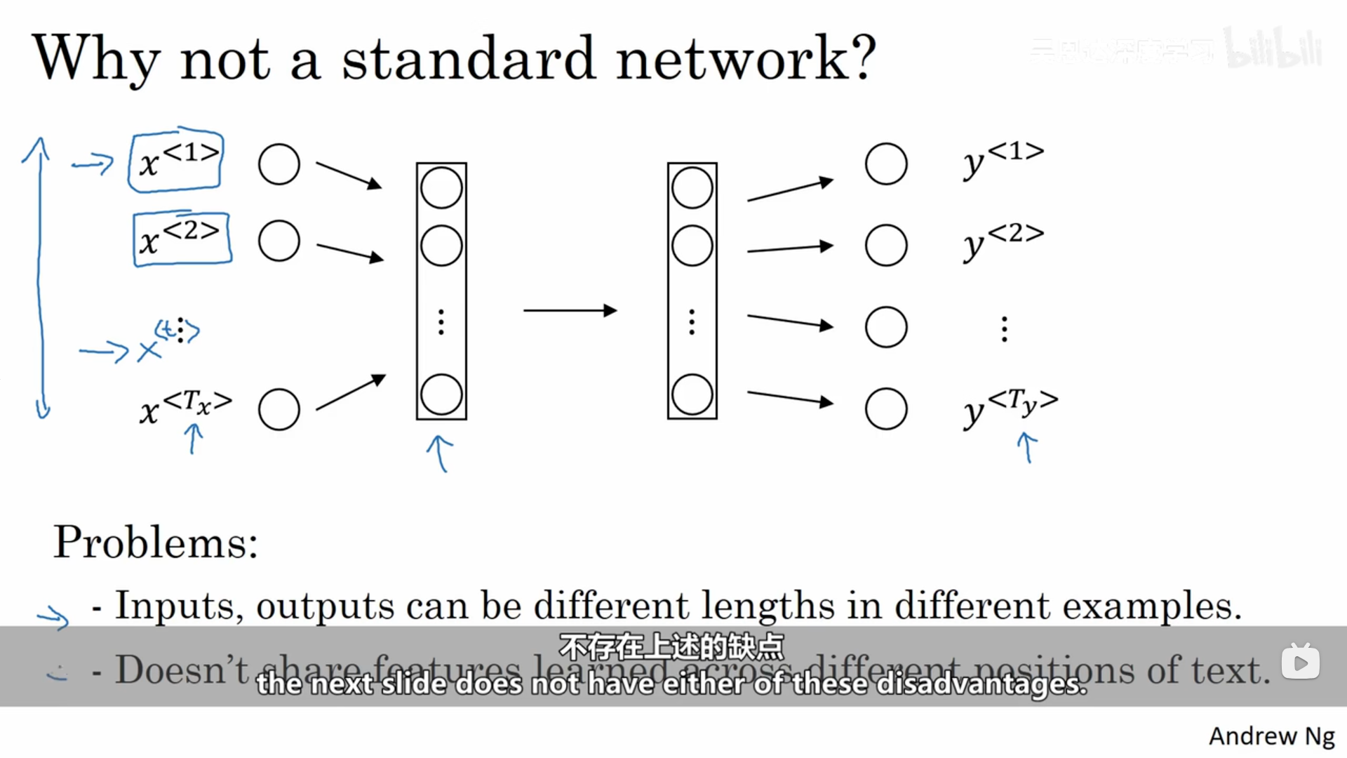 我们可以对上面的数据使用普通的神经网络,但是回存在两个问题:第一个问题每一个样本的输入和输出的大小不同;第二个问题是它并不会共享那些从不同文本位置学到的特征。不仅如此,这样也会导致网络的参数量巨大,计算成本太高。