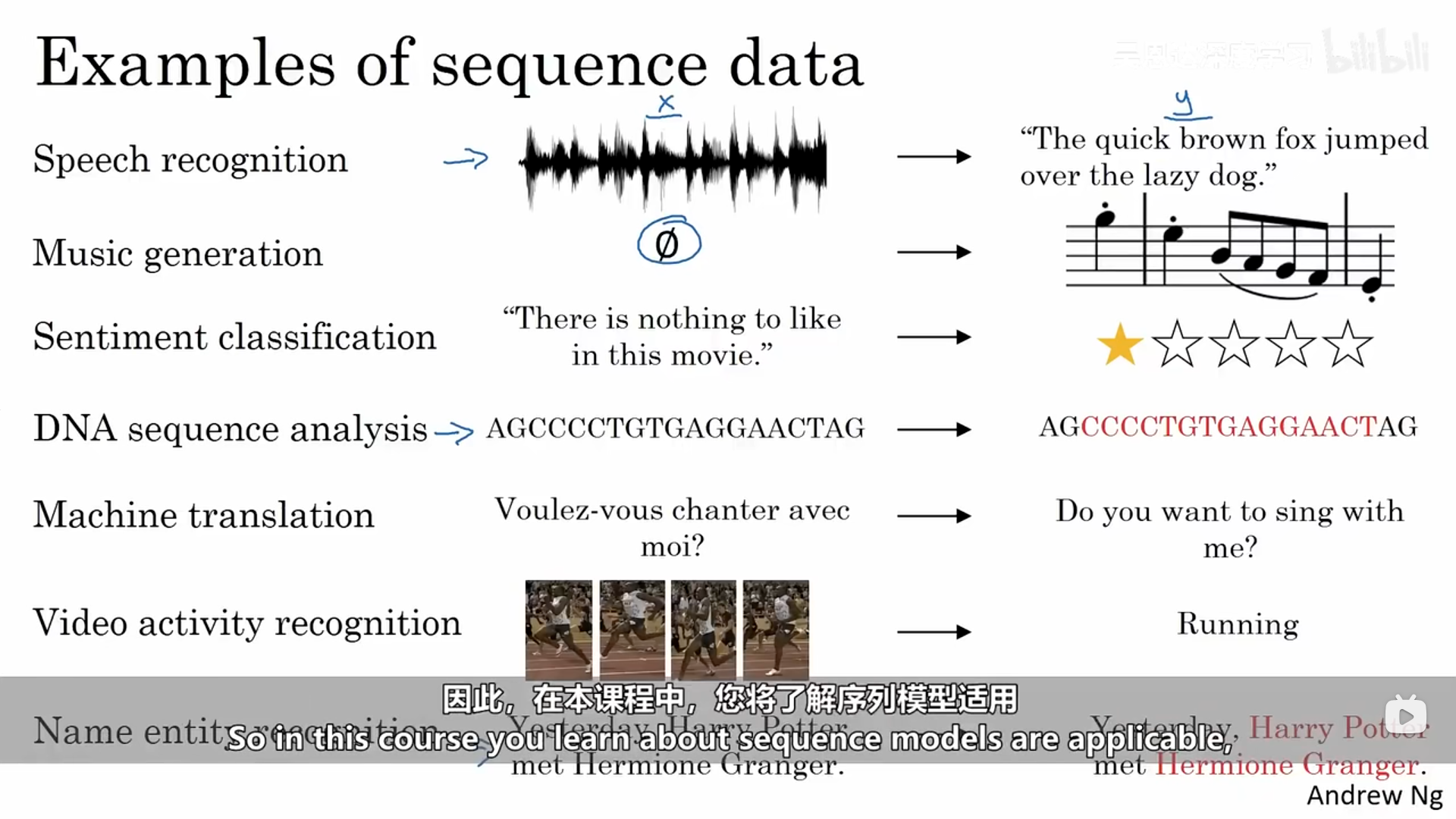 序列模型常常在下列领域得到应用,它们通常是有监督学习,X、Y都为序列数据,或者只有某一个是序列数据。