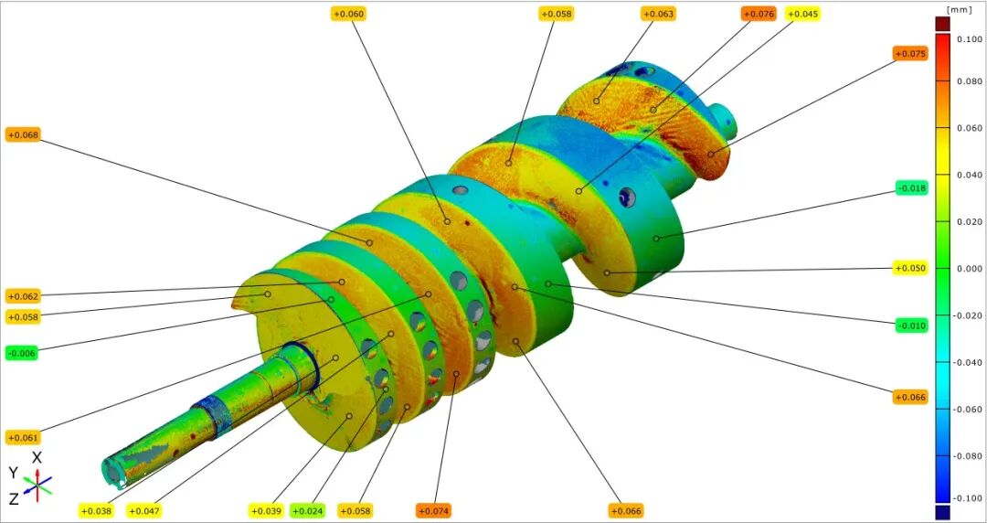采用三维检测软件,通过将点云与原始CAD模型进行精确对齐(最佳拟合或指定基准约束如中心孔轴),可清晰显示全尺寸几何公差,使工艺人员可快速调整工艺,降低质保成本,避免零件故障传递至装配线。
