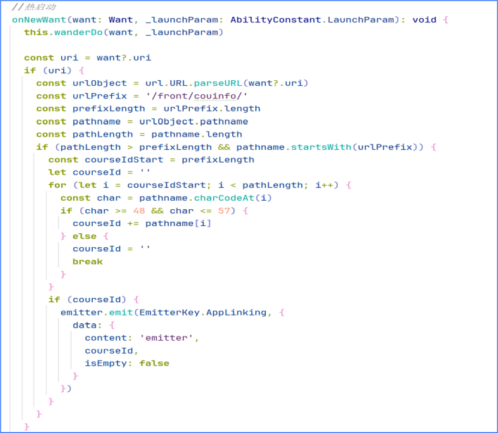第二步:目标方,客户端开发,处理传入的链接,EntryAbility.ets文件中,使用冷启动、热启动的方式,处理传入链接,核心代码如下: