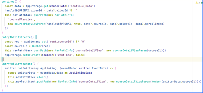 第五步:设备B应用入口,检测到需要接续则跳转课程播放页,Index.ets文件中核心代码如下: