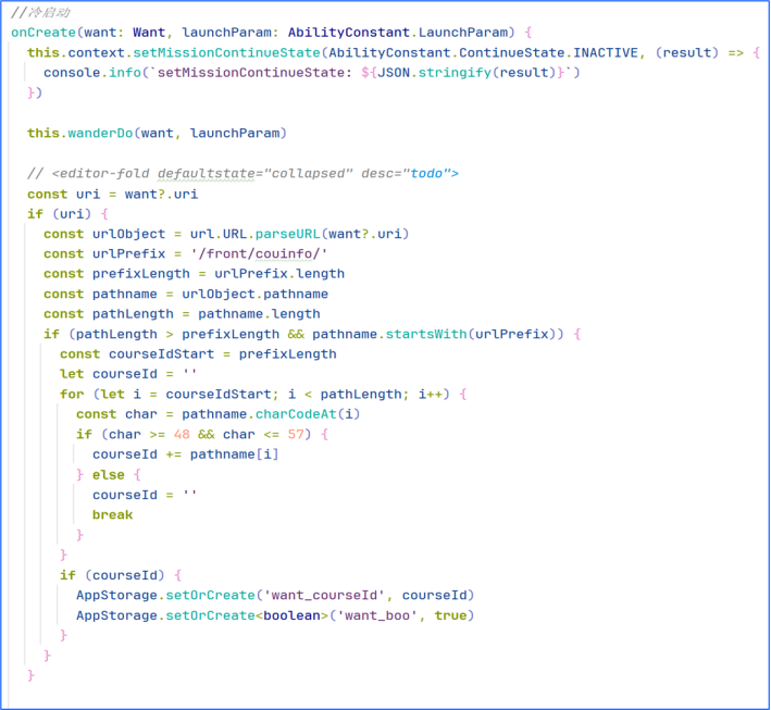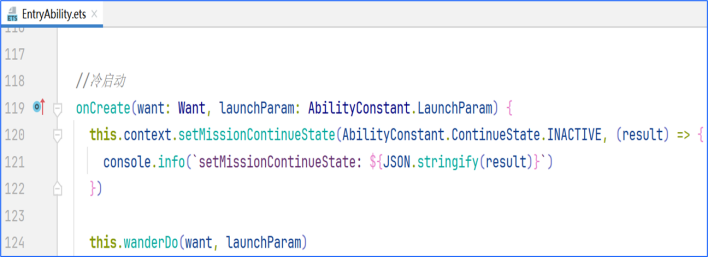 第二步:设备A开启冷启动,配置接续默认关闭,EntryAbility.ets文件,核心代码如下: