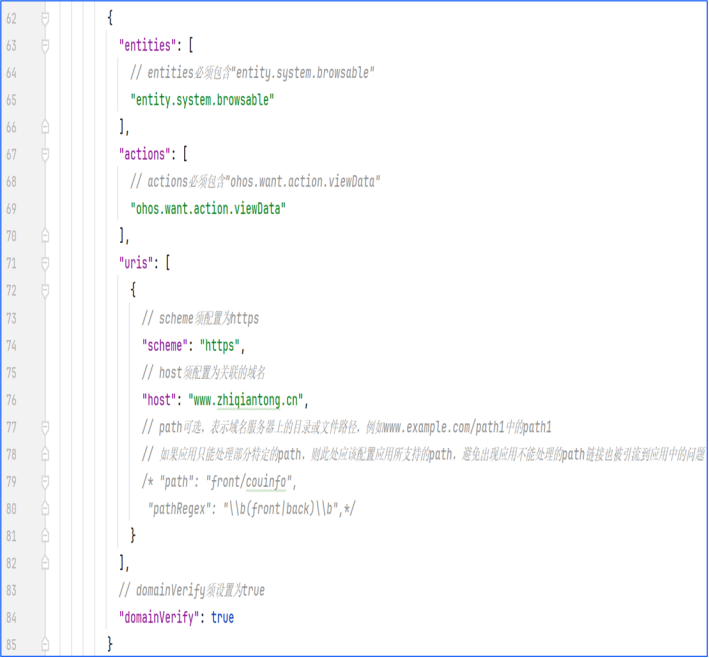 第一步:目标方,客户端开发,在DevEco Studio中配置关联的网址域名。module.json5文件中核心代码如下: