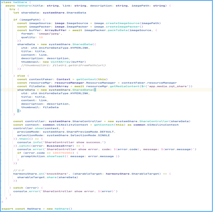 第四步:接下来结合系统分享碰一碰分享链接,再通过系统自动识别链接调用App Linking,在hwShare.ets文件中,封装的系统分享,核心代码如下: