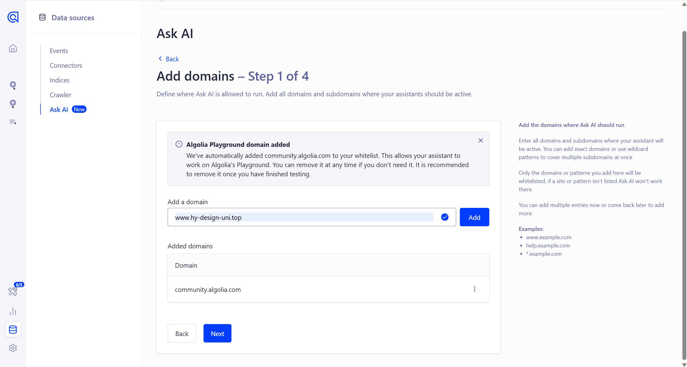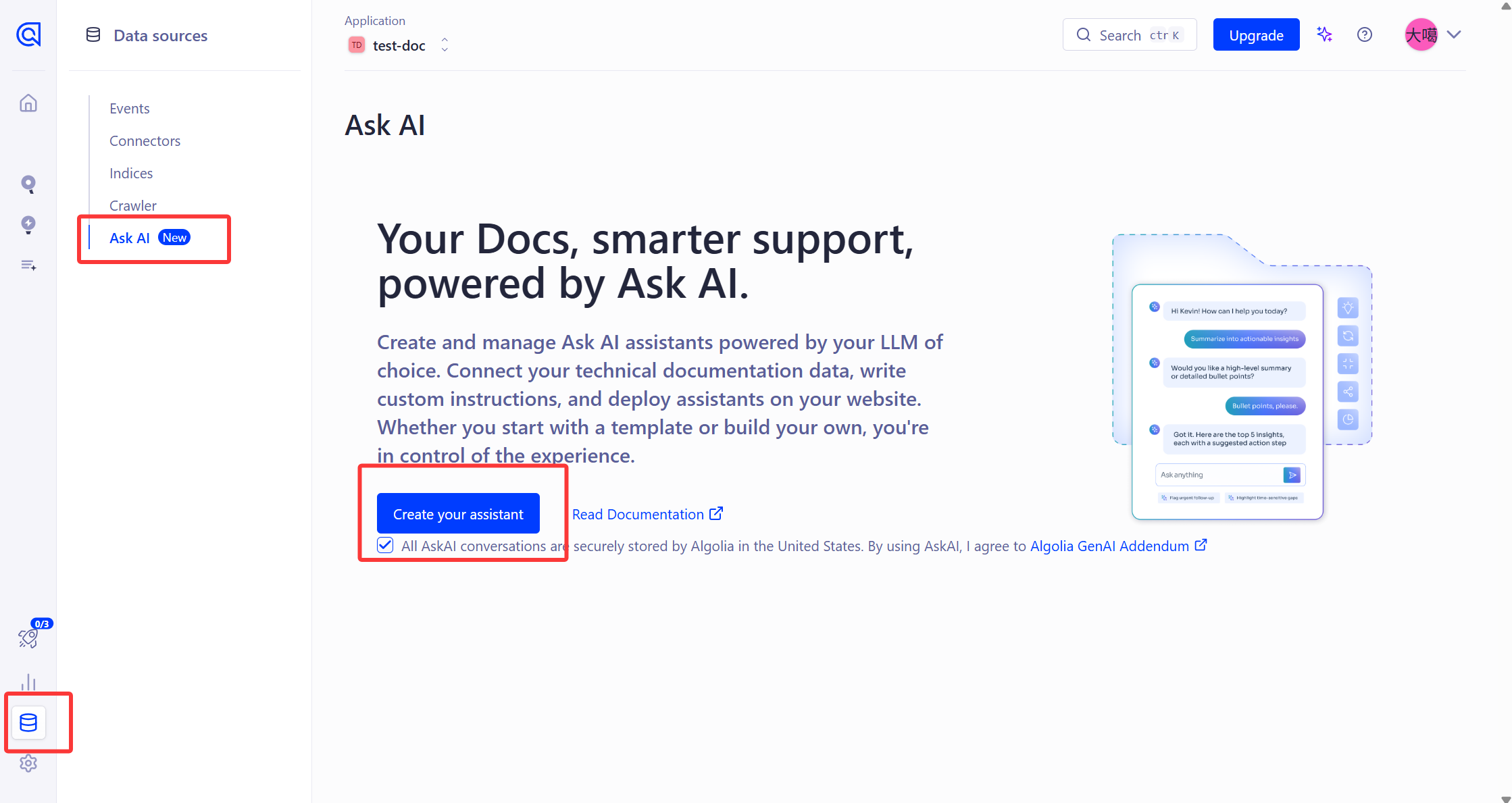 登录 Algolia 控制台,进入已集成搜索功能的应用,按以下步骤创建 AI 助手: