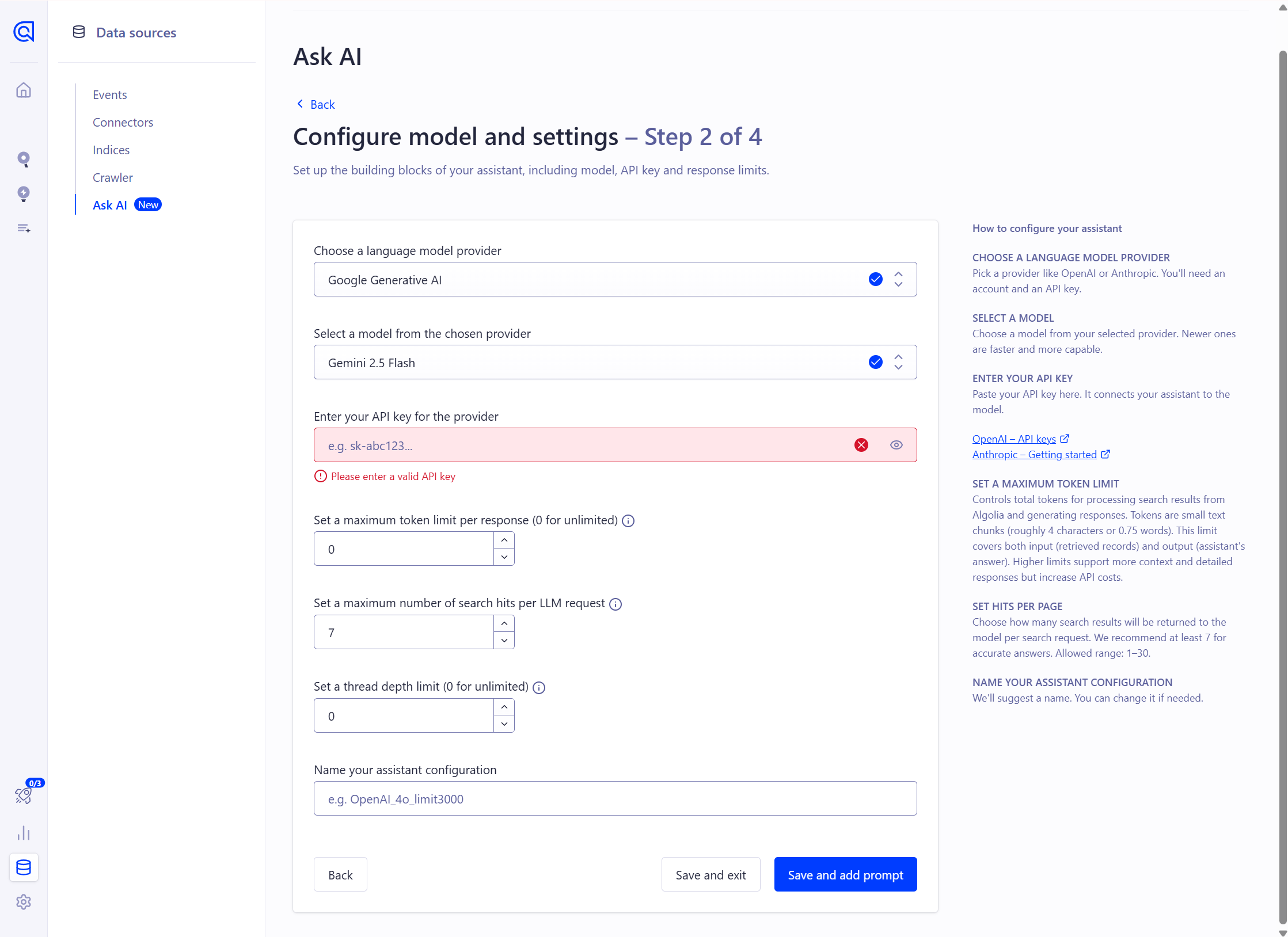 - 返回 Algolia AI 助手配置页,将复制的 Gemini API Key 粘贴至对应输入框,完成模型与 Algolia 的关联