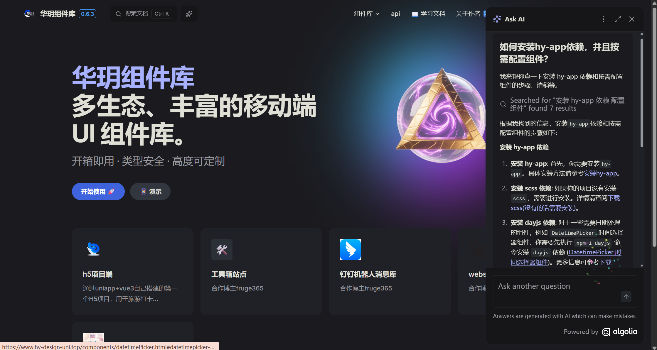 通过修改 VitePress 配置文件,将 Algolia AI 助手嵌入文档,实现侧边栏 AI 问答面板功能。(路径通常为 docs/.vitepress/config.ts)