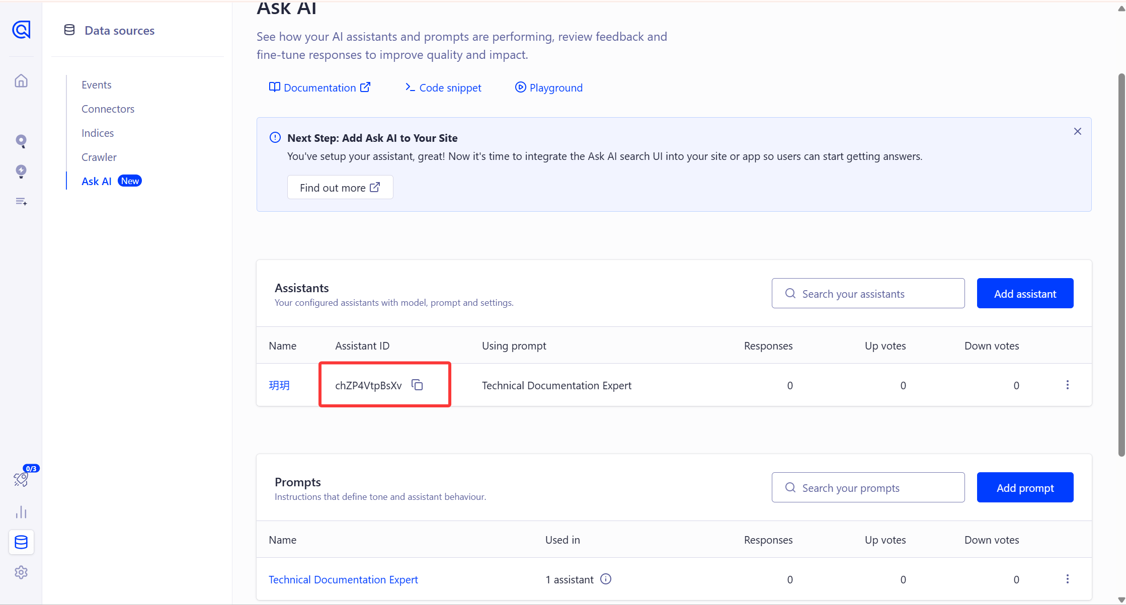 - 在 Algolia AI 助手详情页,找到「助手 ID」字段,点击复制(对应配图:复制 AI 助手 ID 图);