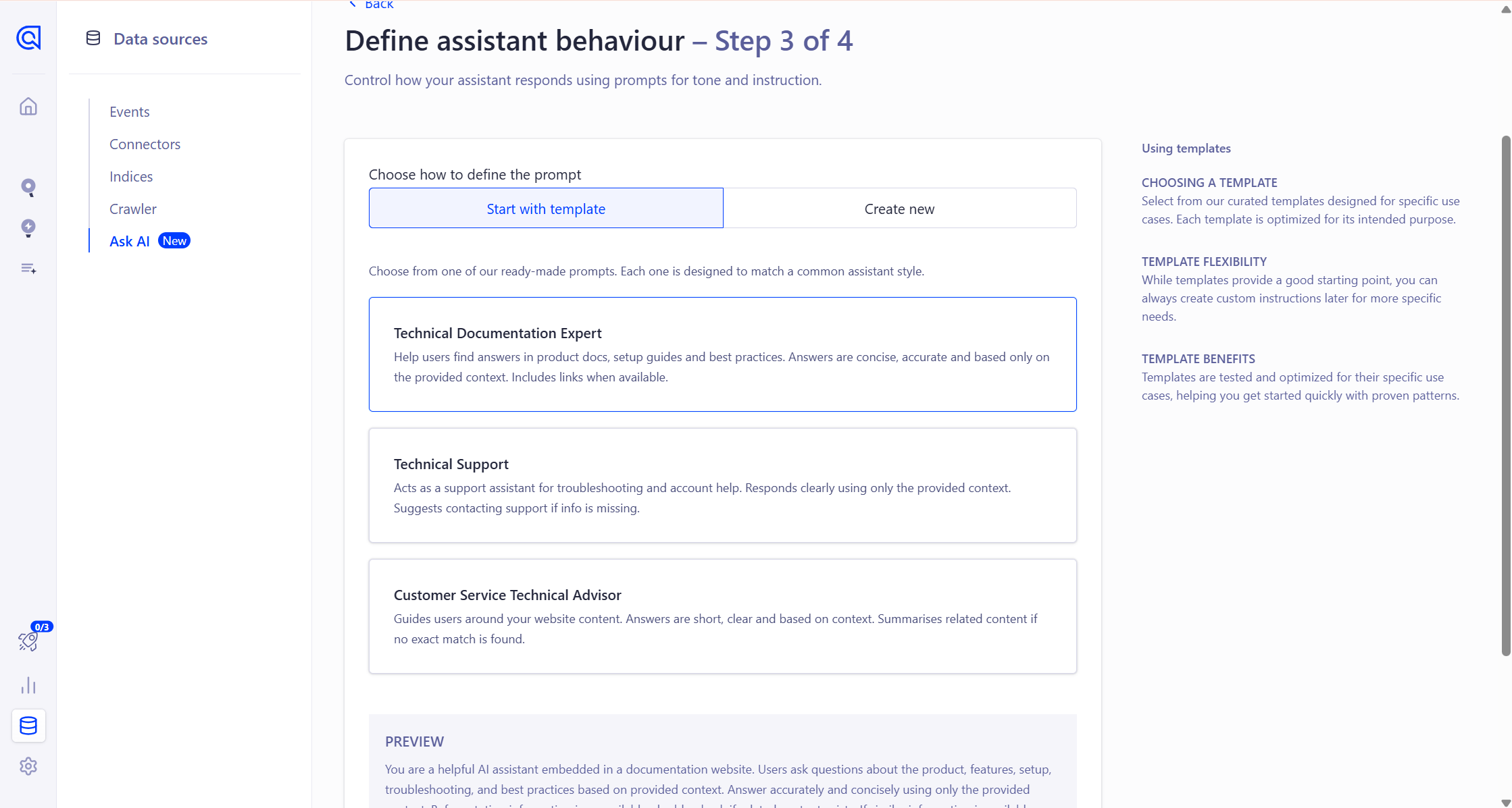 - 模板选择:在 Algolia 提供的模板中,优先选择「技术文档专家」(专为技术文档场景优化,能精准提取文档核心知识点、解答技术问题);若需适配用户咨询场景,也可选择「技术支持」「客户服务技术顾问」(对应配图:选择 AI 助手模板图);