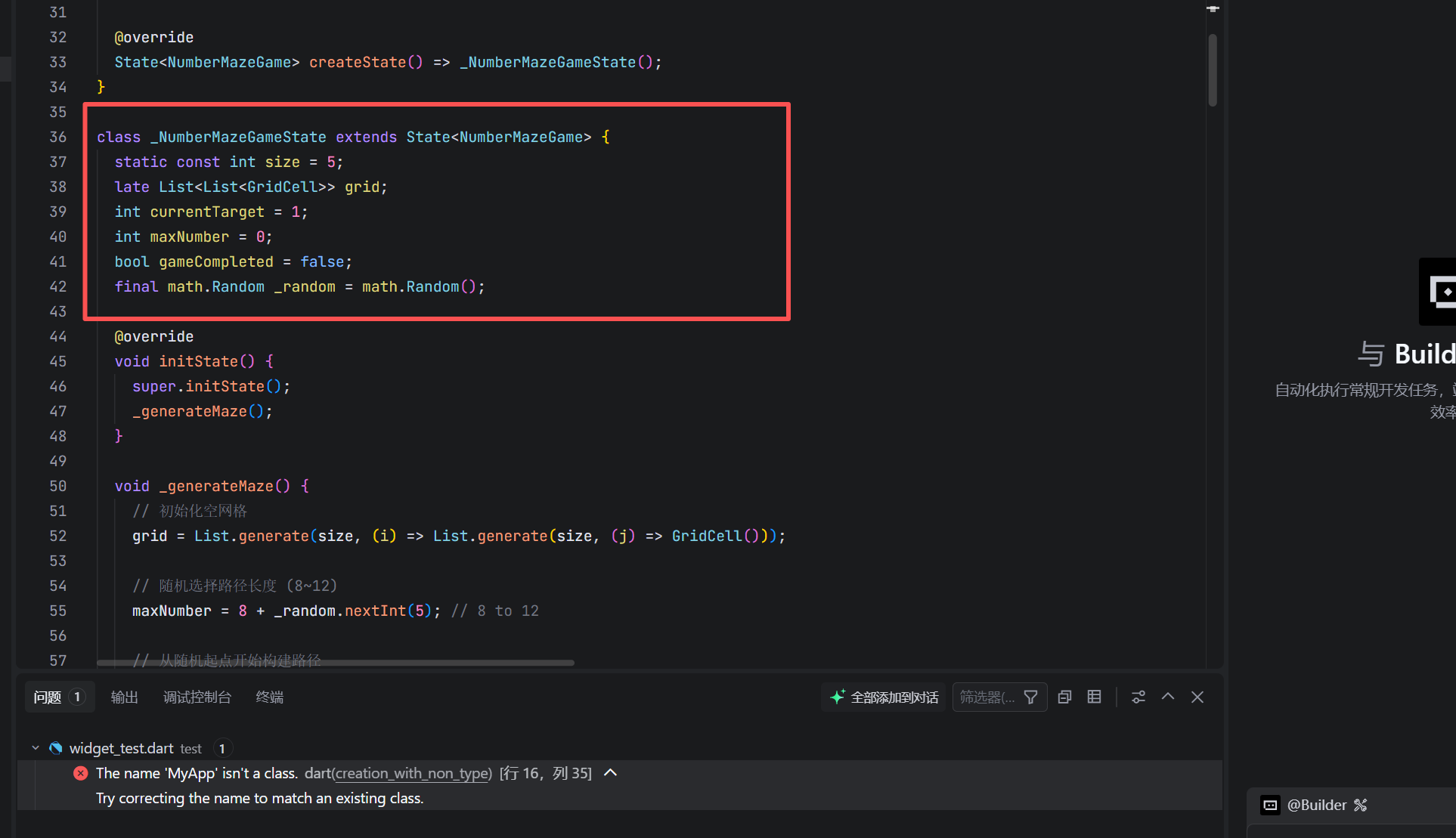 size:硬编码为 5,确保网格固定。若需动态调整,可提升为构造参数。grid:二维列表,表示 5×5 网格。使用late延迟初始化,在initState中赋值。currentTarget:当前应点击的数字(1 ~ maxNumber),是交互逻辑的核心。maxNumber:路径实际长度,由_generateMaze动态确定。gameCompleted:布尔标志,控制游戏是否结束。_random:私有随机数生成器,确保每次生成不同路径。