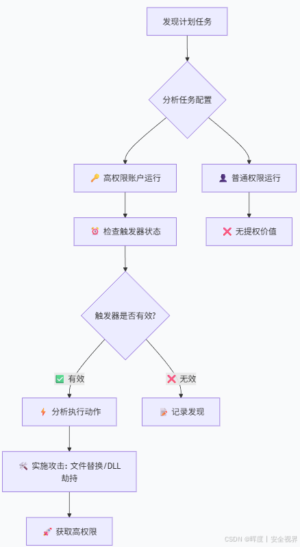 要点 :关注高权限账户 运行的任务 + 可触发 的条件 + 可控制 的执行文件 → 特权升级机会 🎯