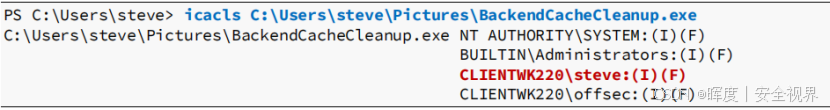 **权限状态表:**正如预期,steve拥有完全访问权限(F),因为可执行文件位于steve的主目录中。