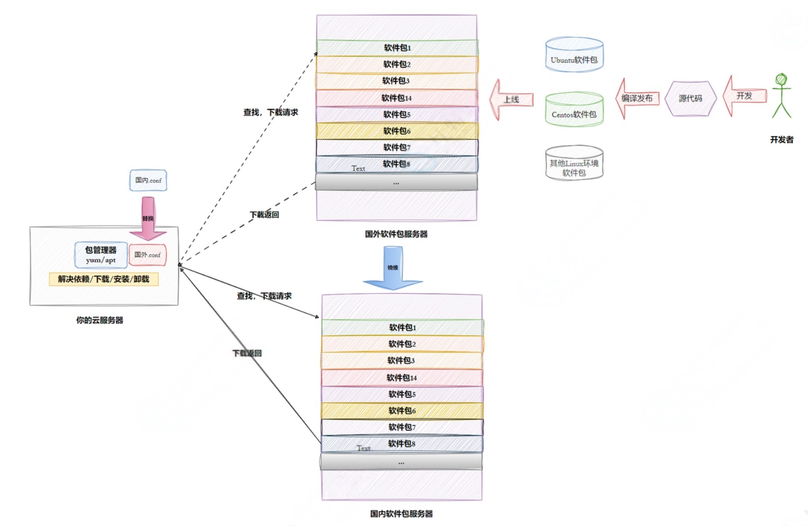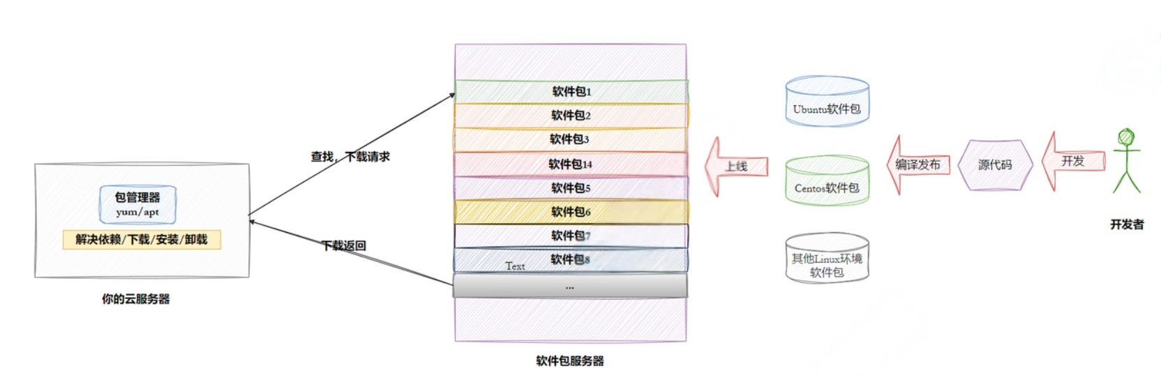 在 Linux系统的开发、运维与日常使用中,软件包管理器是核心基础工具之一,它解决了 Linux 下软件安装、卸载、更新、依赖管理的核心痛点 ------ 如果手动下载软件源码编译或二进制文件安装,不仅要逐个处理依赖库、版本兼容问题,还会导致软件文件散落在系统各处,难以维护和清理.而软件包管理器通过标准化的软件包格式和统一的软件仓库,将软件的获取、安装、配置、升级、卸载全流程自动化,同时实现了依赖的自动检测与解决,是 Linux 系统管理软件的 "管家",也是开发者搭建开发环境、部署应用的必备工具.