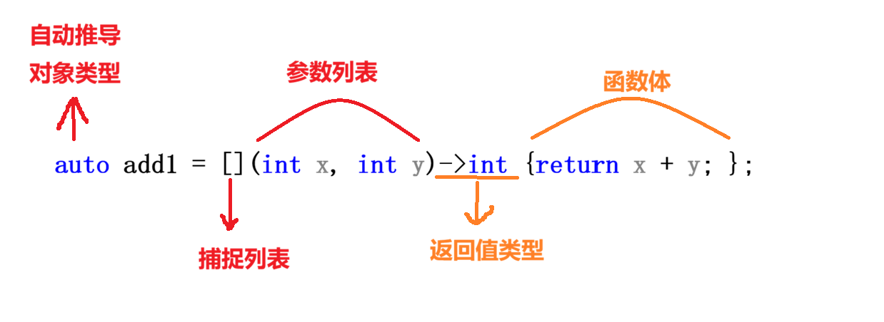 auto用来接收lambda对象,我们不明确它的类型所以使用auto来接收。[capture-list] :捕捉列表 ,该列表总是出现在lambda函数的开始位置,编译器根据[]来判断接下来的代码是否为lambda函数,捕捉列表能够捕捉上下⽂中的变量供 lambda 函数使⽤,捕捉列表可以传值和传引⽤捕捉 。另外捕捉列表为空时也不能省略。(parameters) :参数列表,与普通函数的参数列表功能类似,如果不需要参数传递,则可以连同()⼀起省略->return type :返回值类型,用追踪返回类型形式声明函数的返回值类型,没有返回值时此部分可省略。⼀般返回值类型明确情况下,也可省略,由编译器对返回类型进行推导。{function boby} :函数体,函数体内的实现跟普通函数完全类似,在该函数体内,除了可以使用其参数外,还可以使用所有捕获到的变量,函数体为空也不能省略。
