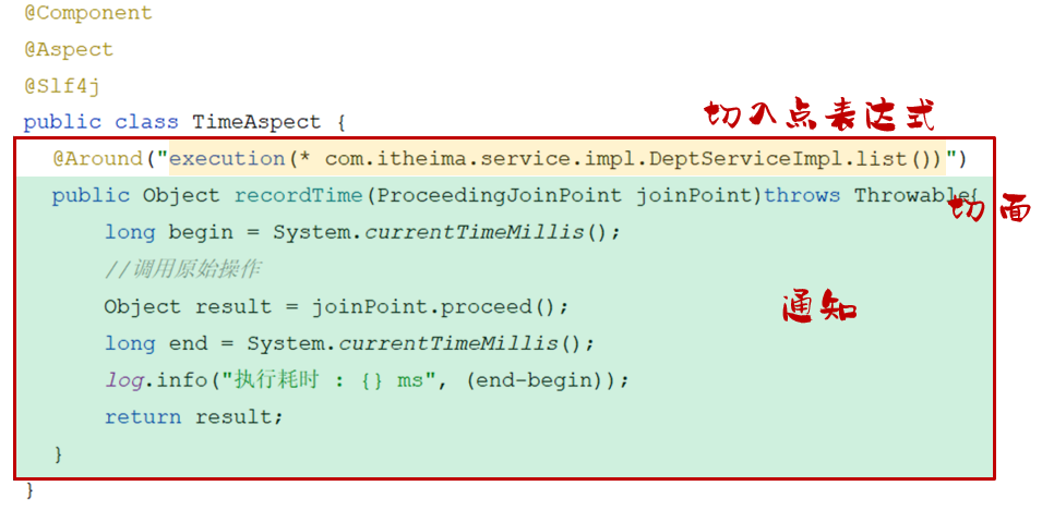 要匹配业务接口当中所有的增删改的方法,而增删改方法在命名上没有共同的前缀或后缀。此时如果使用execution切入点表达式也可以,但是会比较繁琐。 当遇到增删改的方法名没有规律时,就可以使用 annotation切入点表达式
