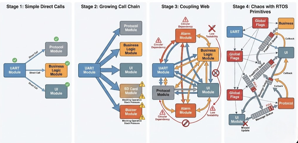 很多工程师有一种错觉:"只有大型 Linux 系统才需要架构,单片机这种资源受限的系统,越简单越好。"
