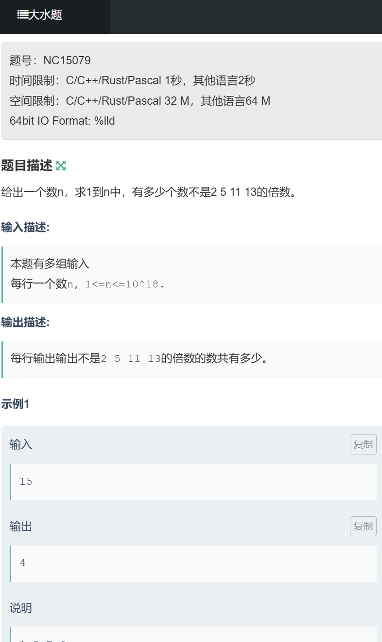 题目描述:给出一个数 n(1≤n≤1e18),求 1 到 n 中不是 2、5、11、13 的倍数的数的个数(多组输入)。