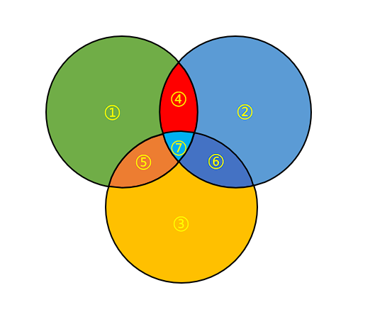 - 解释:先加三个集合的元素数,再减去每两个集合的重叠部分,最后补回三个集合都重叠的部分(因为前面多减了一次)。
