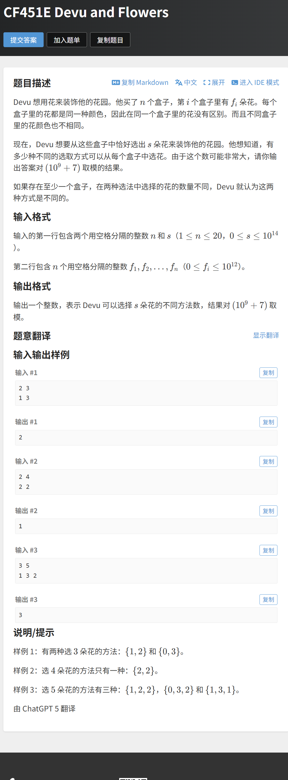 [3.5 例题 5:Devu and Flowers(洛谷 CF451E)------ 容斥 + 隔板法,多重集组合](#3.5 例题 5:Devu and Flowers(洛谷 CF451E)—— 容斥 + 隔板法,多重集组合)