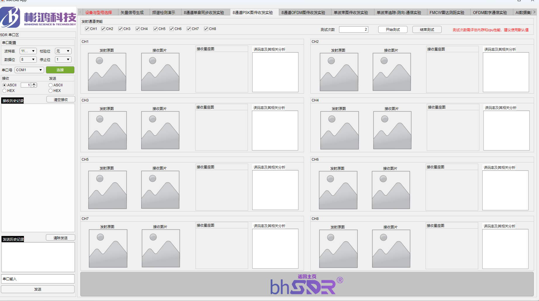 bhSDR小助理:8通道PSK 图传实验 是无线通信里的 "实力派",相比单音信号,它能承载图像等复杂数据流,还自带抗干扰能力,实用场景广泛。核心是验证 3 个关键能力: