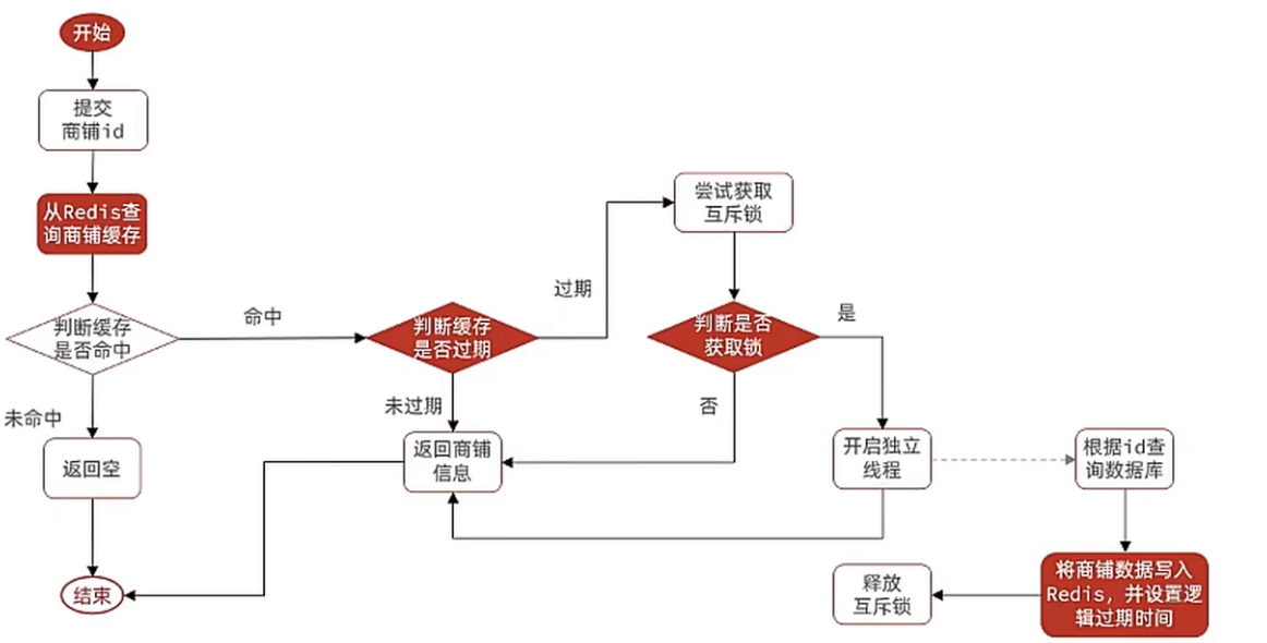 首先判断缓存是否命中,如果不命中直接返回空,若名字就要判断缓存是否逻辑过期,若未过期,直接返回,过期了就尝试获得互斥锁,如果没有获得锁,就先返回旧数据,获得了锁就开启线程池来根据数据库查询新的数据并写入缓存