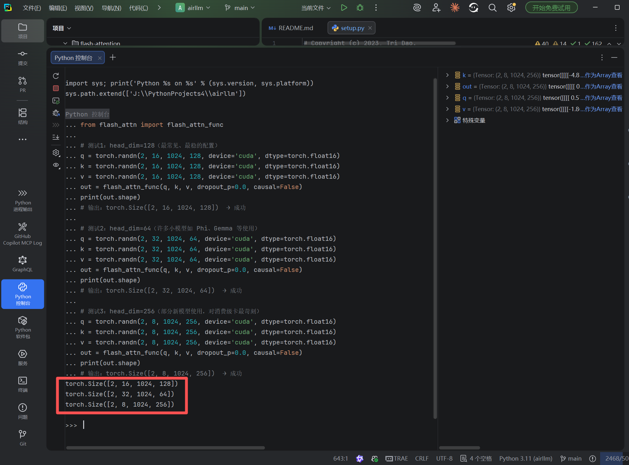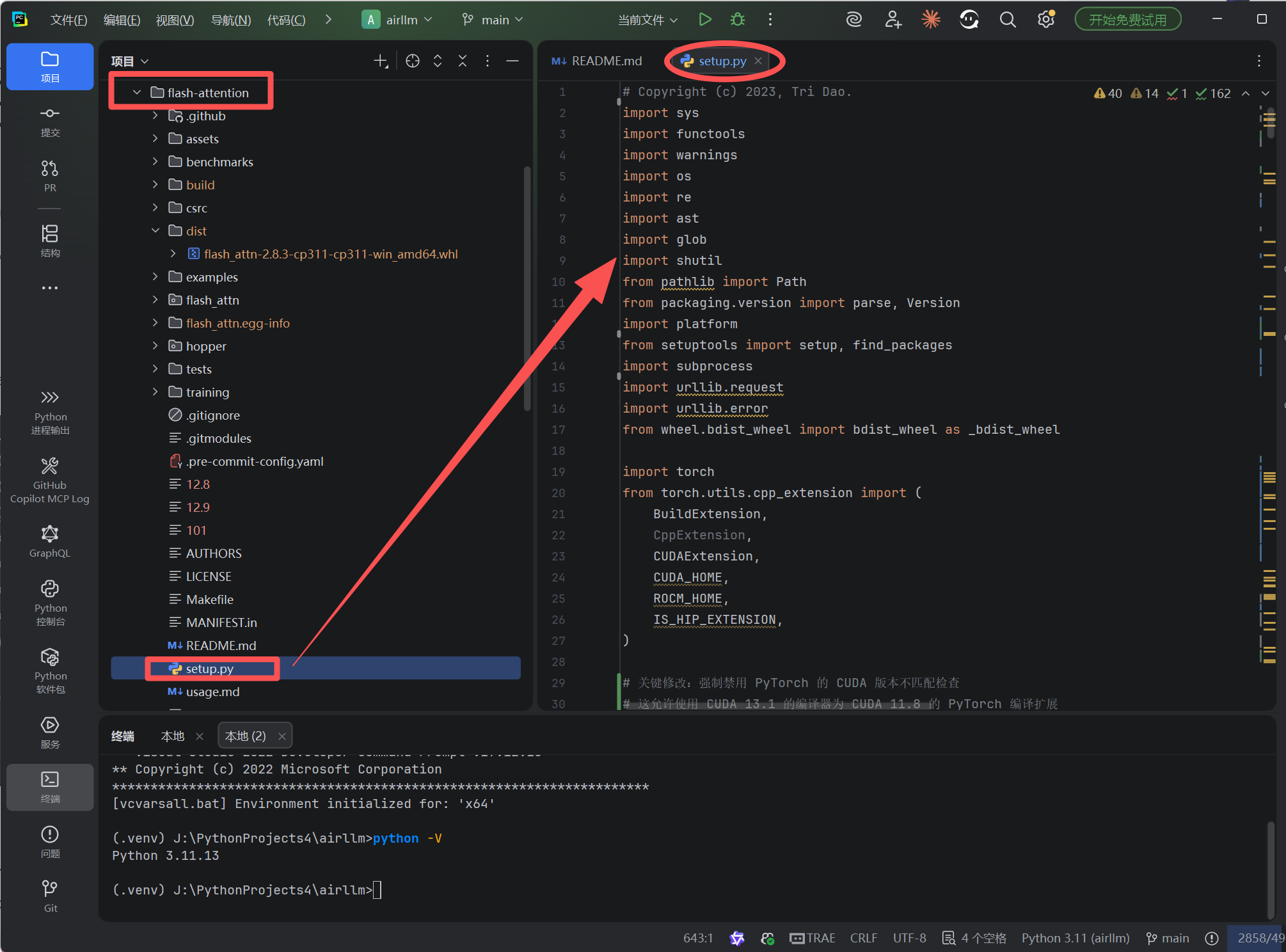 通过修改 setup.py 中的两处检查逻辑------Flash Attention 自身的版本下限检查 和PyTorch 强制的版本匹配检查------我们可以在 Windows 环境下使用高版本 CUDA Toolkit 为低版本 PyTorch 编译 Flash Attention。