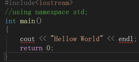可以见到,当去掉using引入的名称空间后,cout和endl都出现了错误,也就是说,我们使用的cout、cin等其实严格来说是std::cout、std::cin,实际应当写成下面的形式: