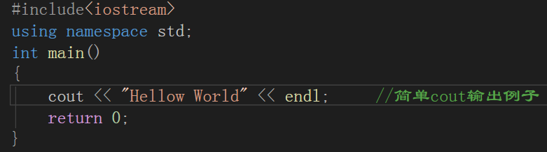 首先看istream。其实istream可以看作是一个包含输出功能的类,这里的类是C++面向对象特性中非常重要的一个概念,不过这里暂时不展开讲。按照已有的C语言的知识来看,我们大可以暂时将它视作一个结构体的升级promax版本,它为我们提供了非常重要的cout对象(对象也是一个非常重要的概念,不过这里同样不展开讲,先简单地看作是结构体变量吧)。cout类似于C语言中的printf(),能够进行消息的输出,但是cout的书写格式又和printf大不一样,具体见下图代码: