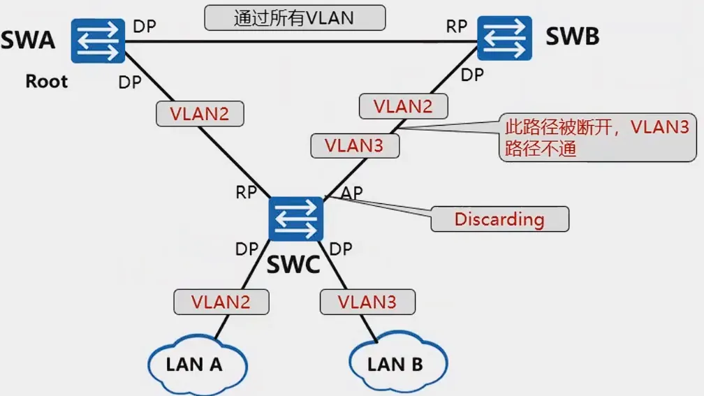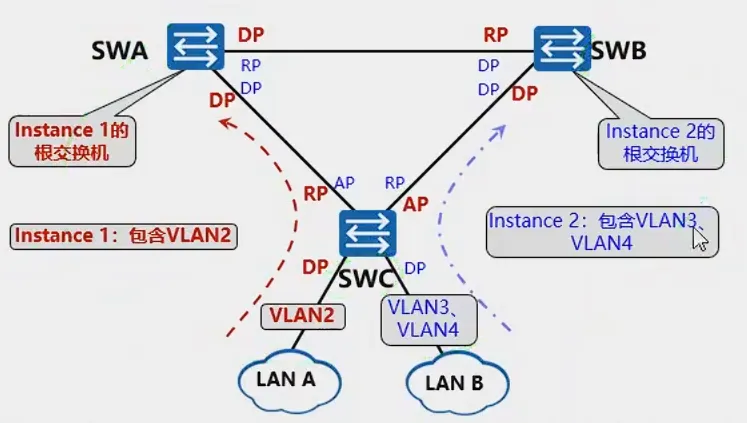 一个MST域内可以生成多个生成树,每颗生成树都成为一个MSTI,每个MSTI都使用单独的RSTP算法计算单独的生成树