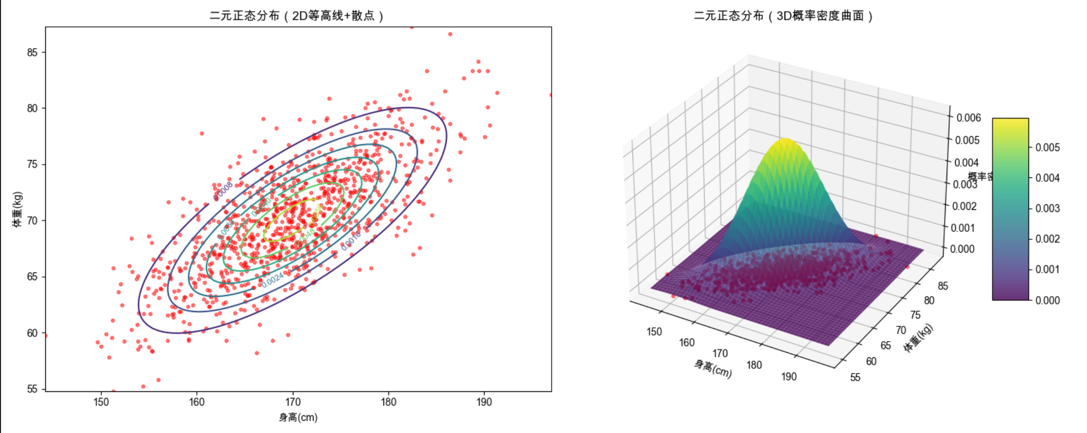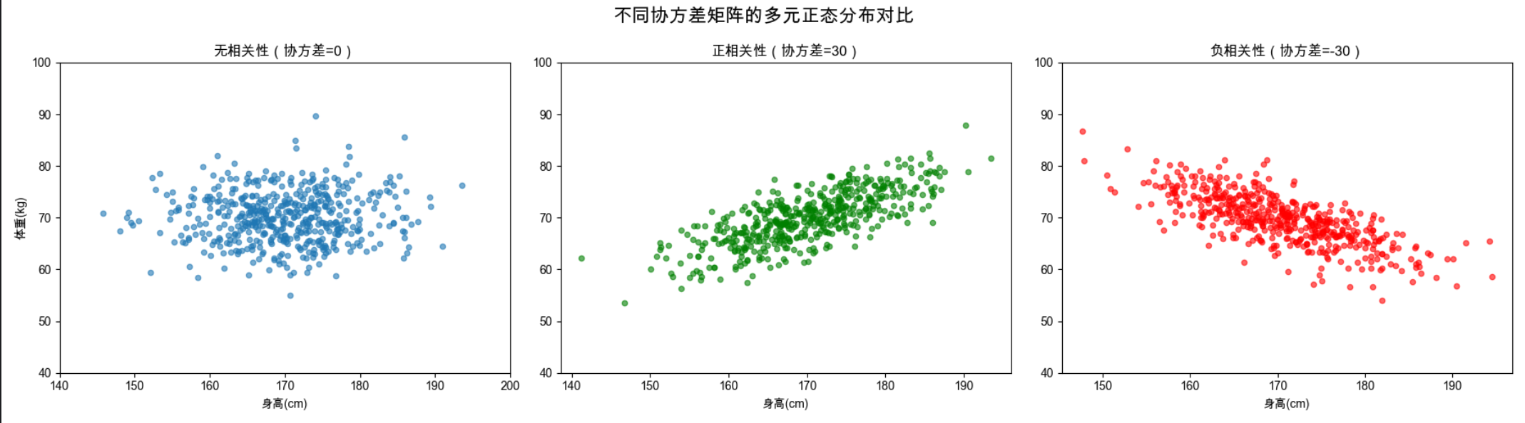 weight = 0.6 * height + np.random.normal(0, 5, n_samples) # 体重与身高正相关