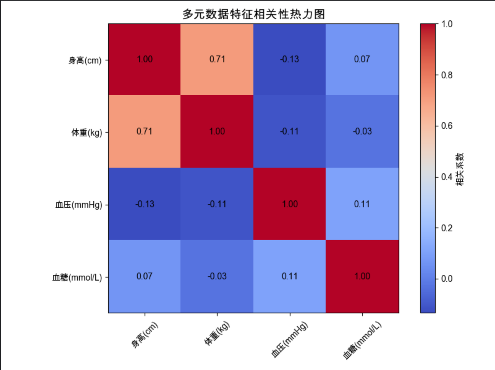 - 输出相关性矩阵,并显示热力图(直观看到身高和体重相关系数≈0.87)