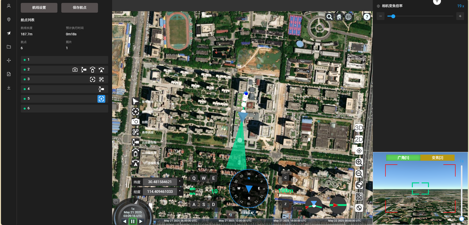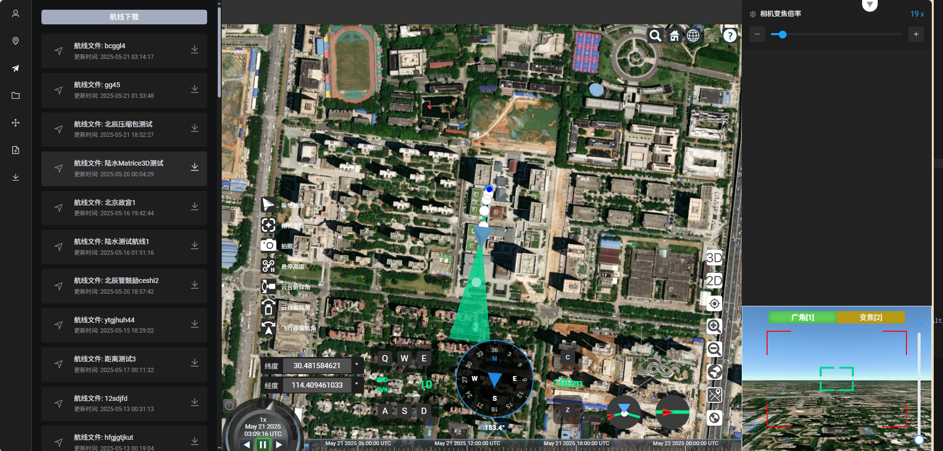 SimulatedFlight.vue:模拟飞行主界面,负责航线点的展示、模拟飞行控制、与三维模型的联动。DroneLen.vue:无人机镜头视角控制,响应模拟飞行过程中的相机参数变化。ModelAdd.vue:模型导入与管理界面。Upload.vue:航线导出与下载界面。ImportRoute.vue:航线文件导入界面。