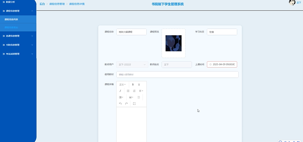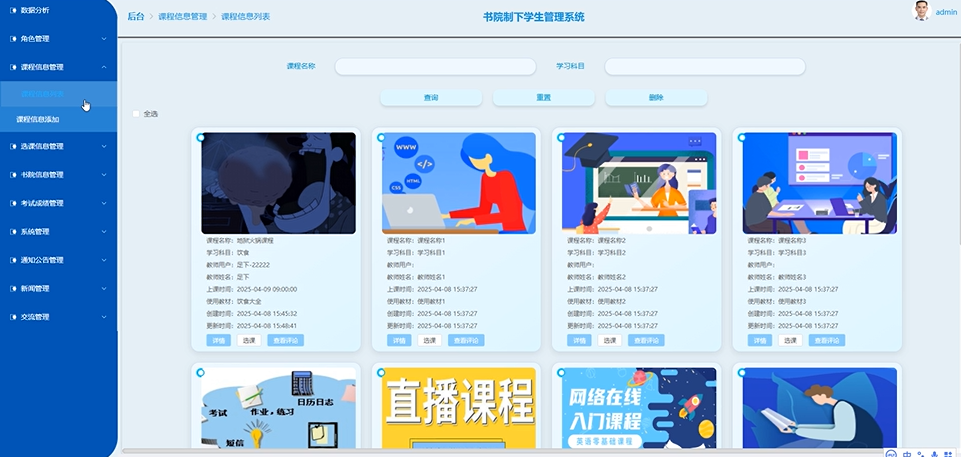 管理员可以全局管理课程库,审核教师提交的课程变更申请。课程信息管理界面如下图所示。