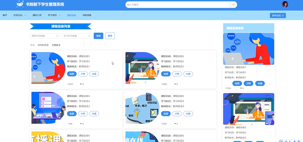 Vue框架则赋予前端界面以动态交互能力,组件化开发模式让页面布局灵活多变,用户操作体验更加友好。学生、教师及管理员可通过统一入口访问系统,便捷完成课程查询、书院课程信息管理、通知接收、成绩提交等日常任务。
