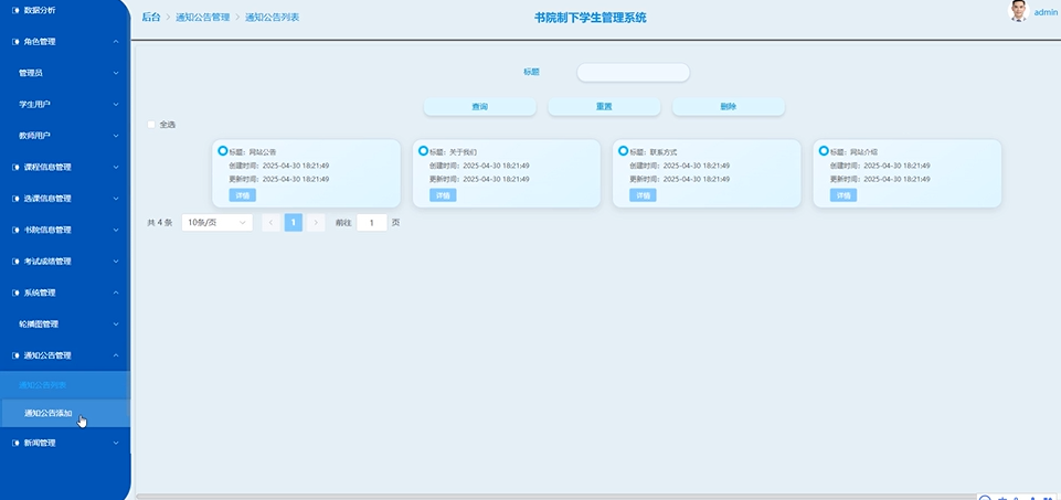 管理员发布、编辑及删除全校性通知,设置公告优先级与有效期。通知公告管理界面如下图所示。