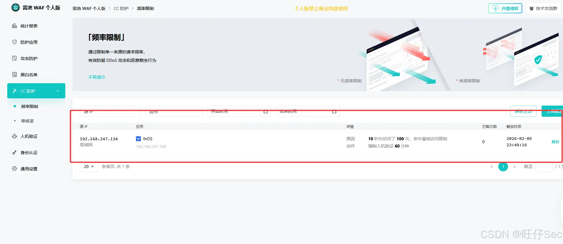 回到雷池中可以看到已经对cc攻击的源IP进行了处理