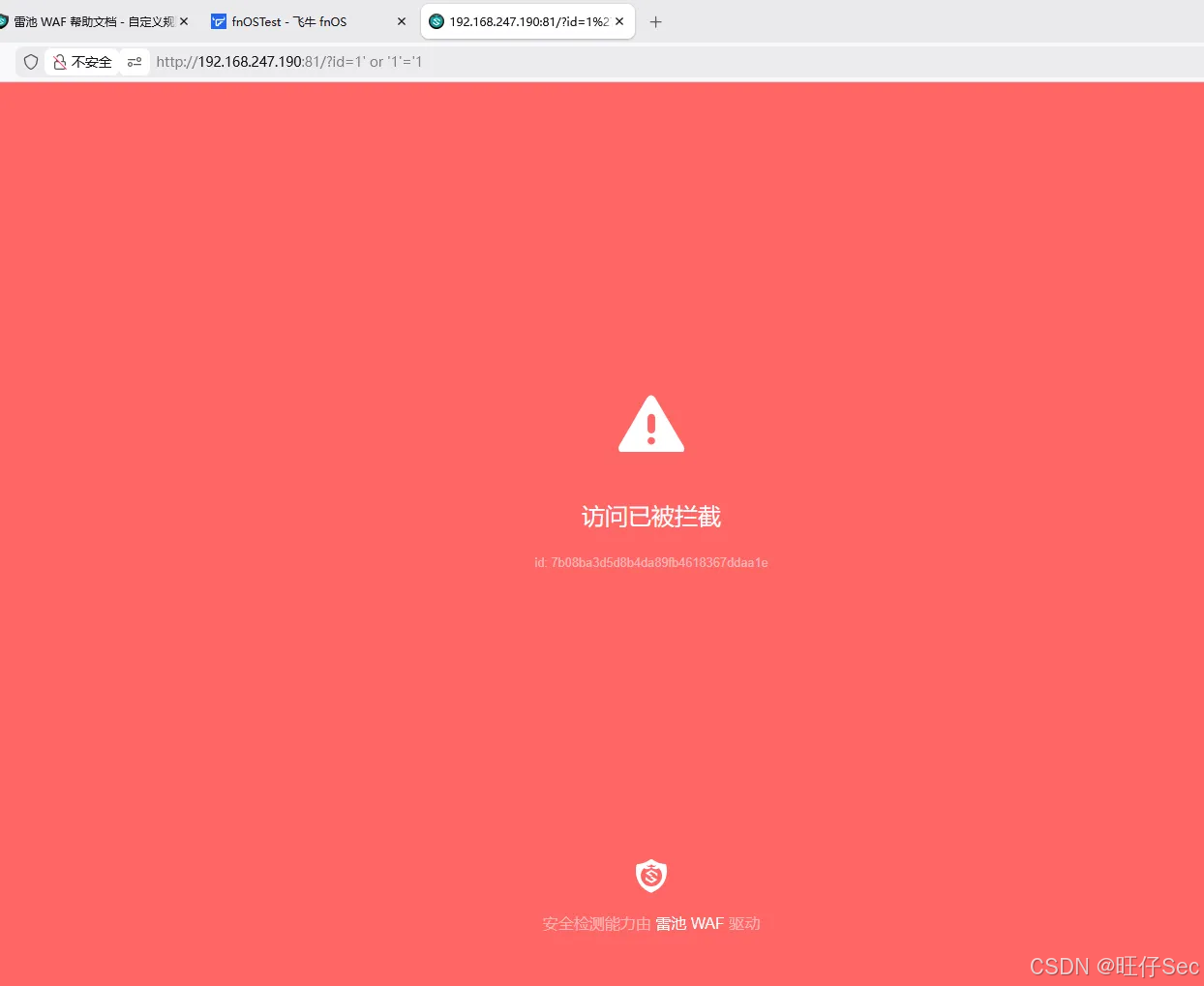 预期结果:页面提示"请求被拦截"(雷池触发SQL注入防护规则),说明防护生效。