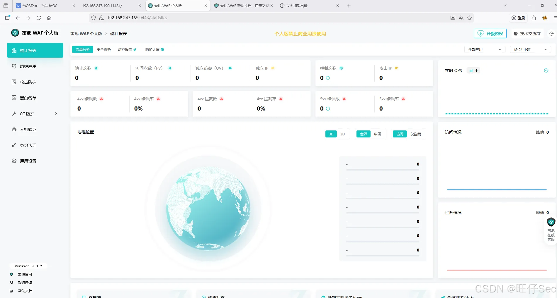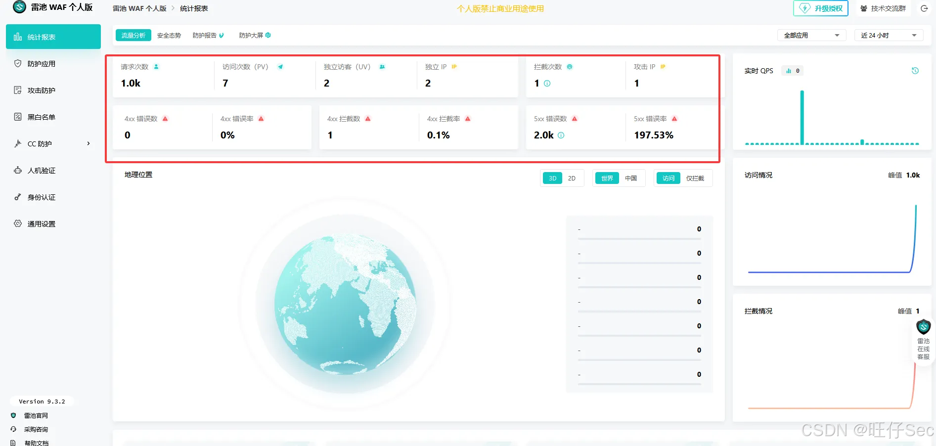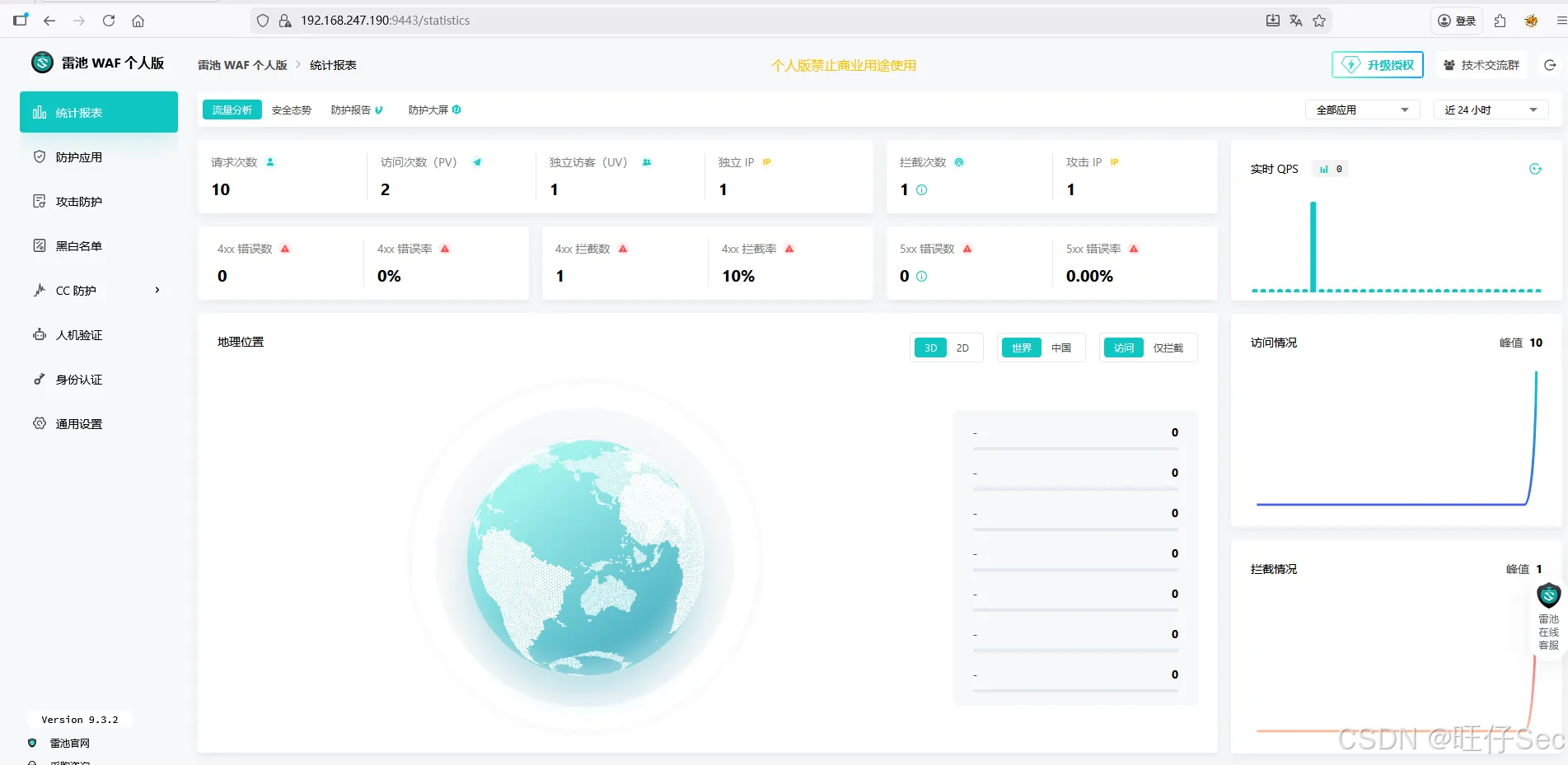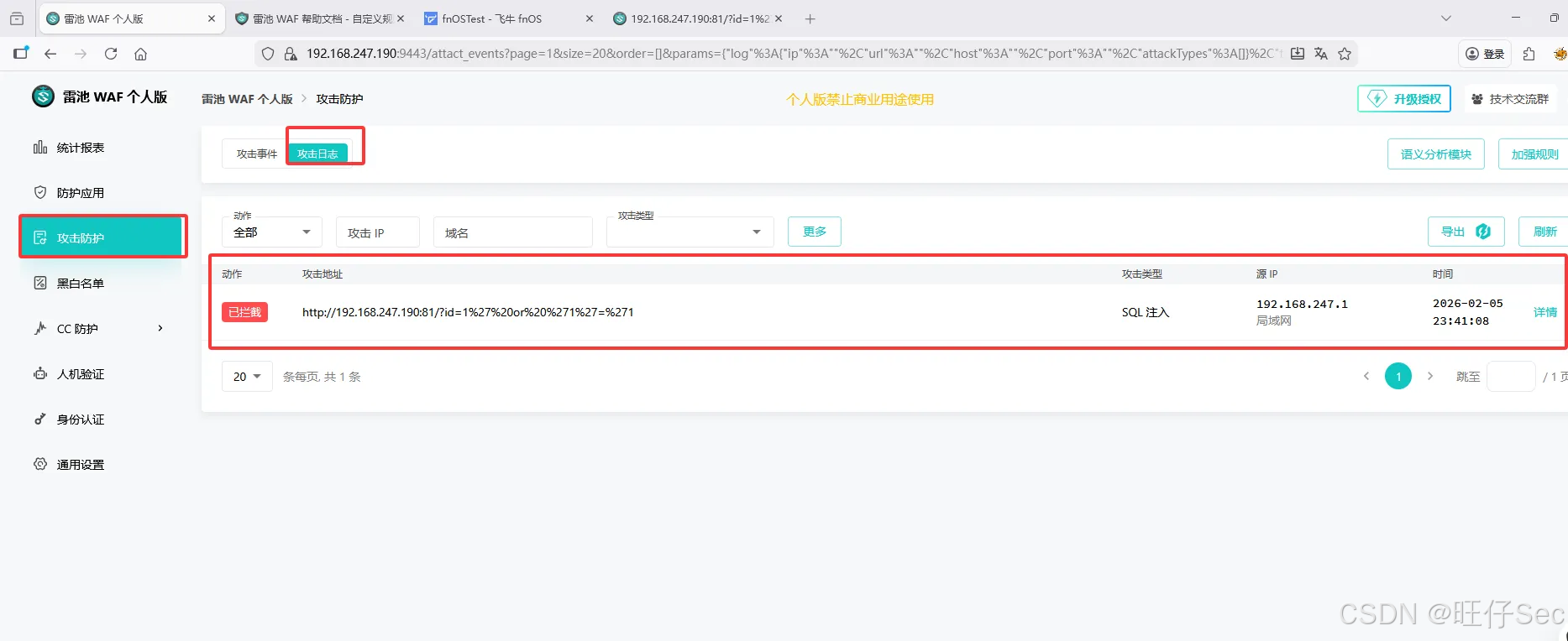 - 点击「仪表盘」,可查看实时防护统计(如拦截次数、攻击类型分布、Top攻击IP),本文测试后可看到"SQL注入"类型的拦截记录。