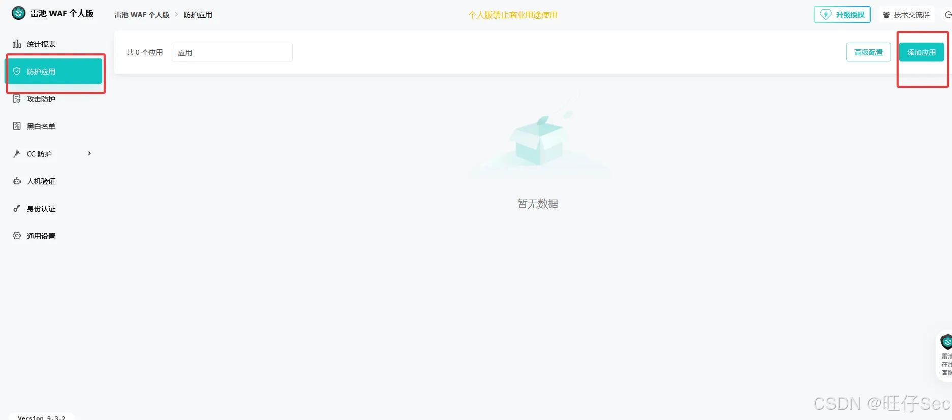 登录雷池控制台后,点击左侧菜单栏「防护应用」→ 右上角「添加应用」。